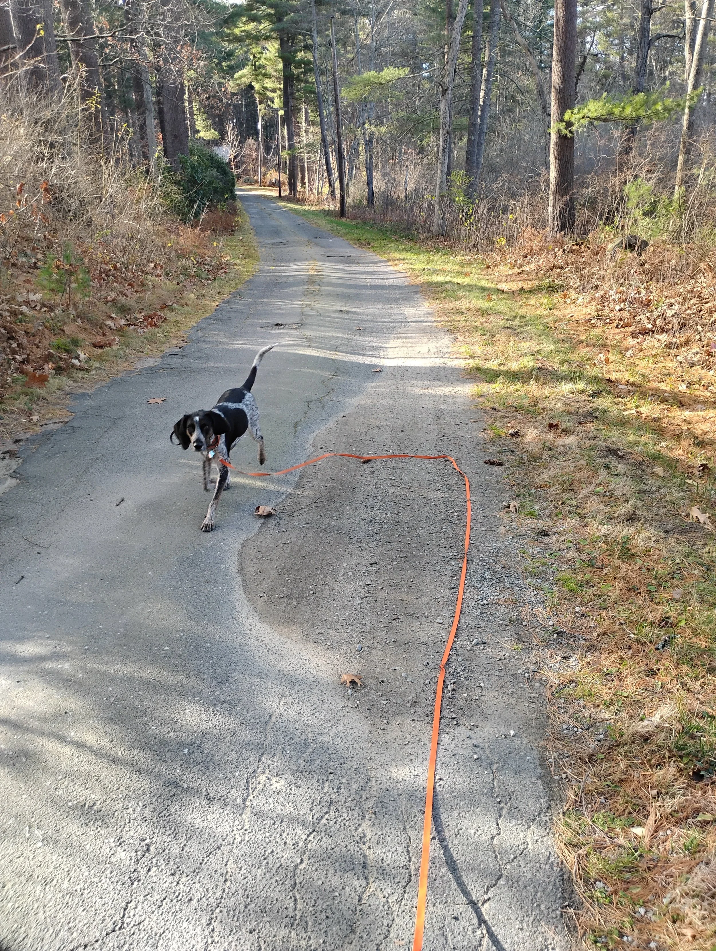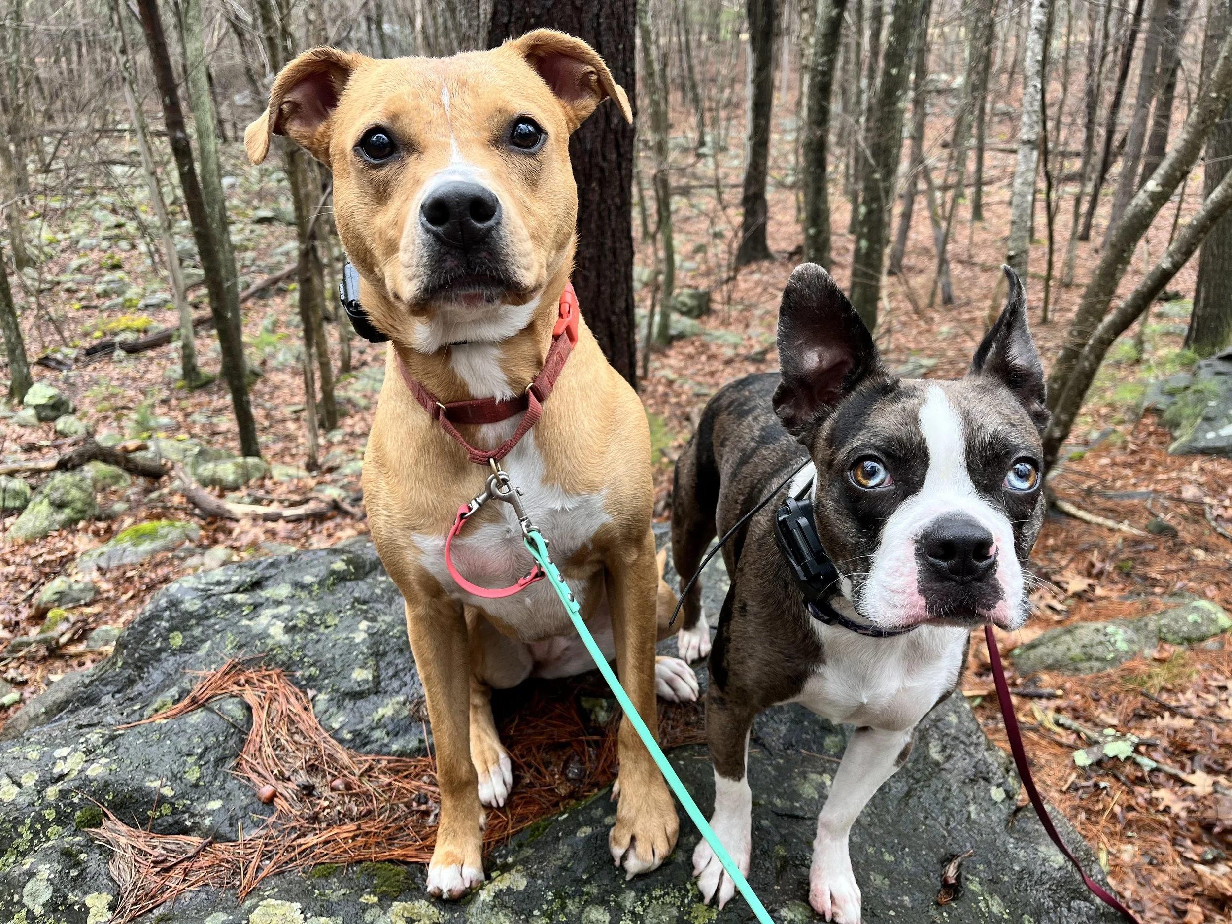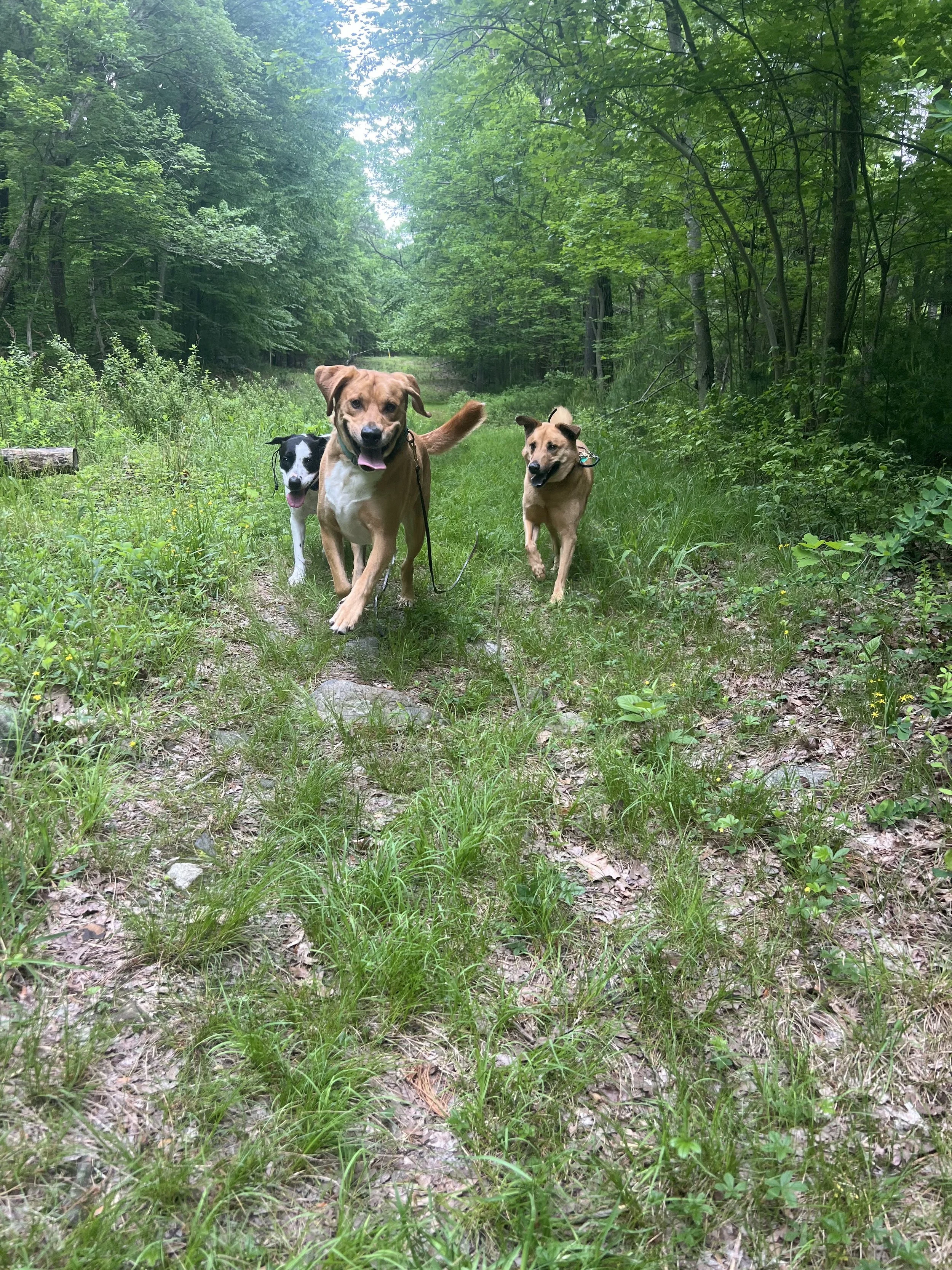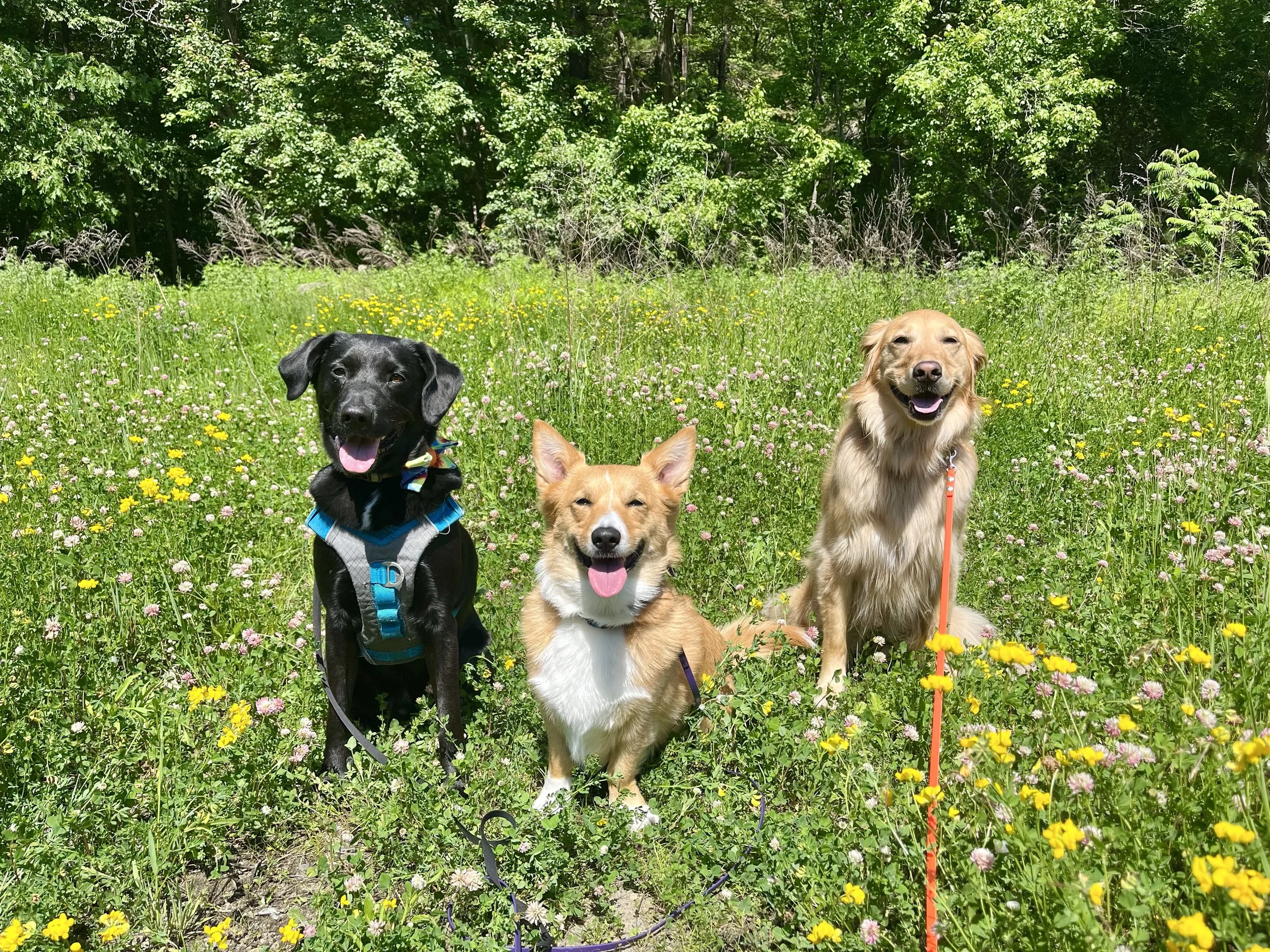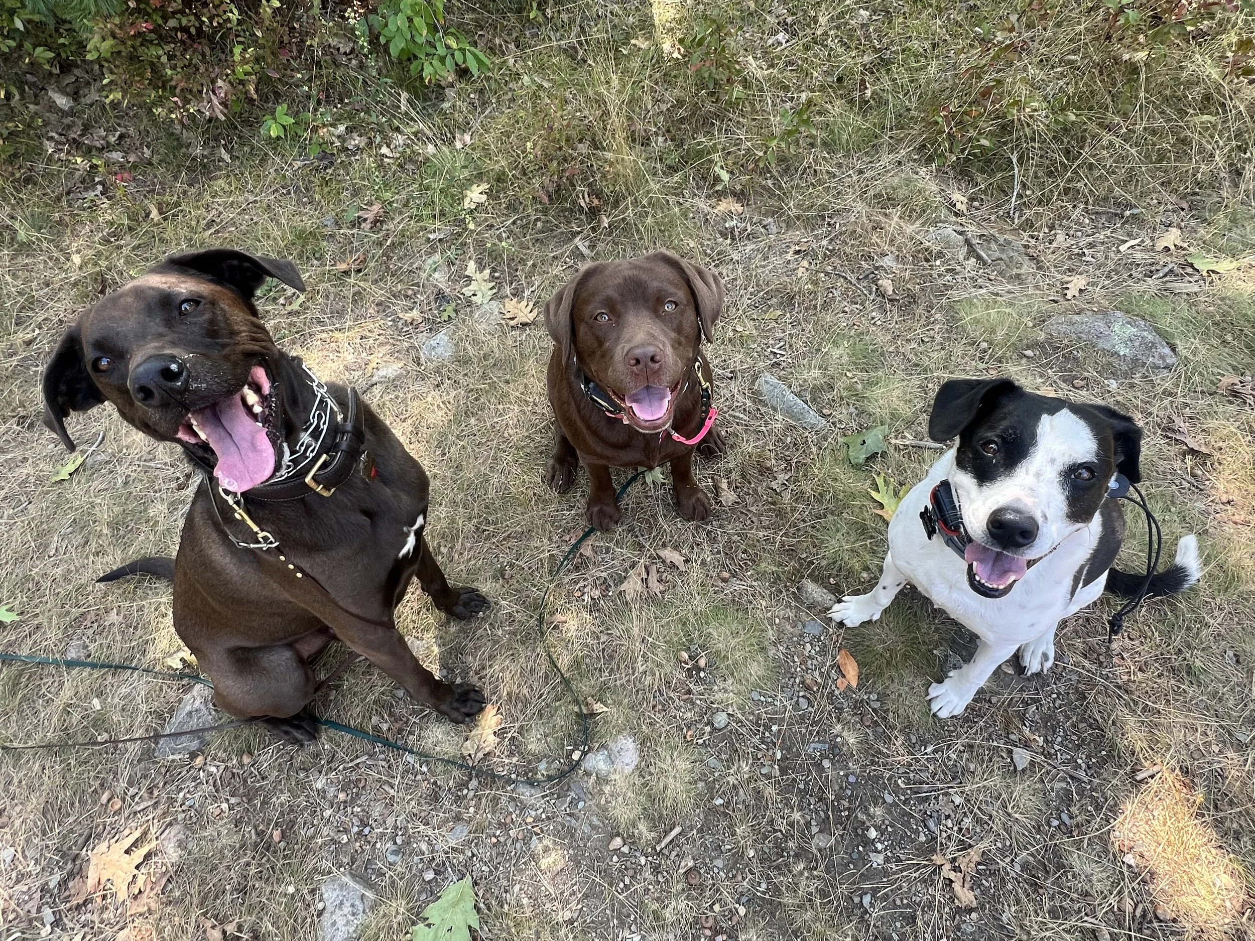 Pepper, Cooper, and Levi practicing recall on a Pack Hike