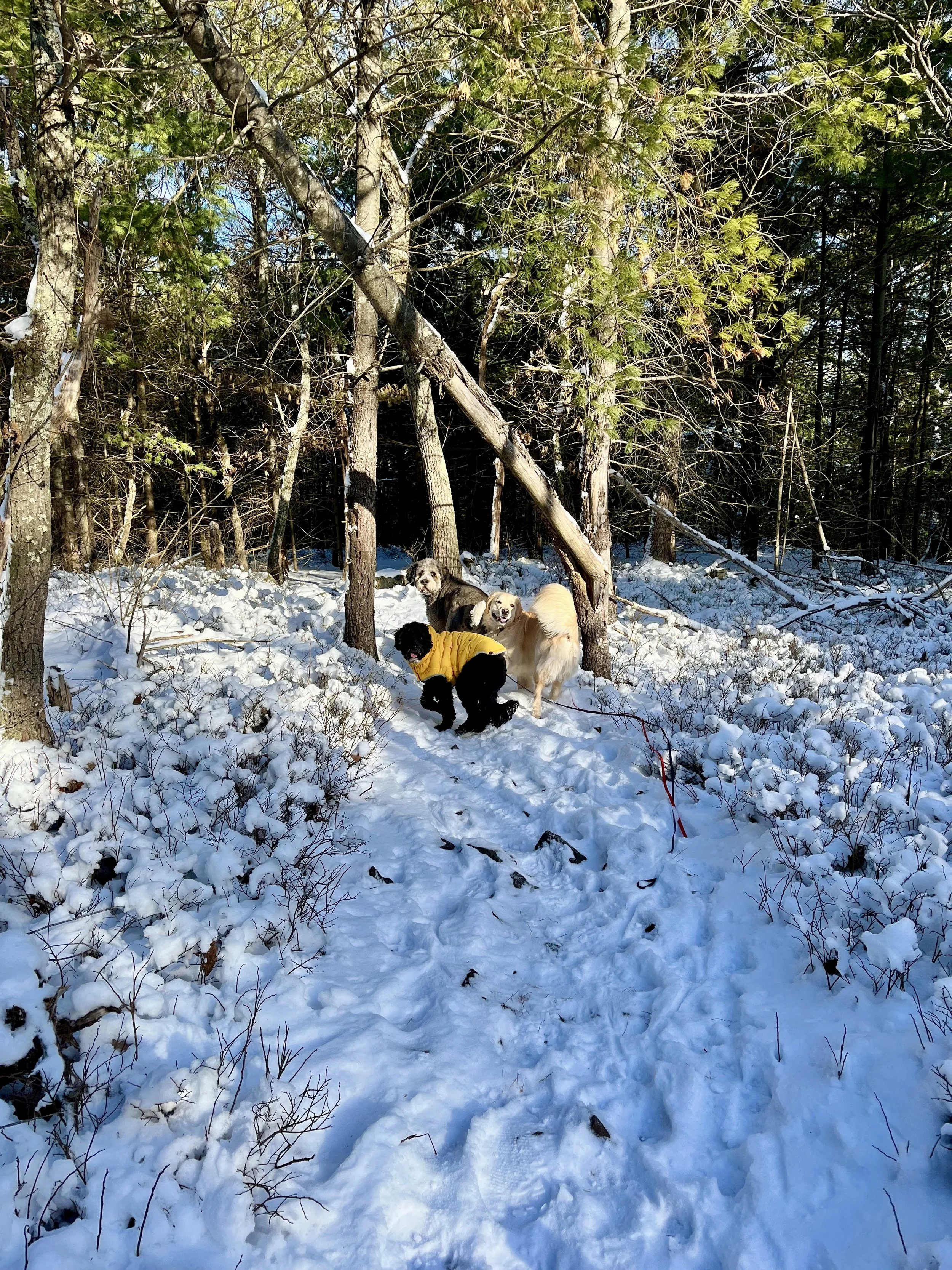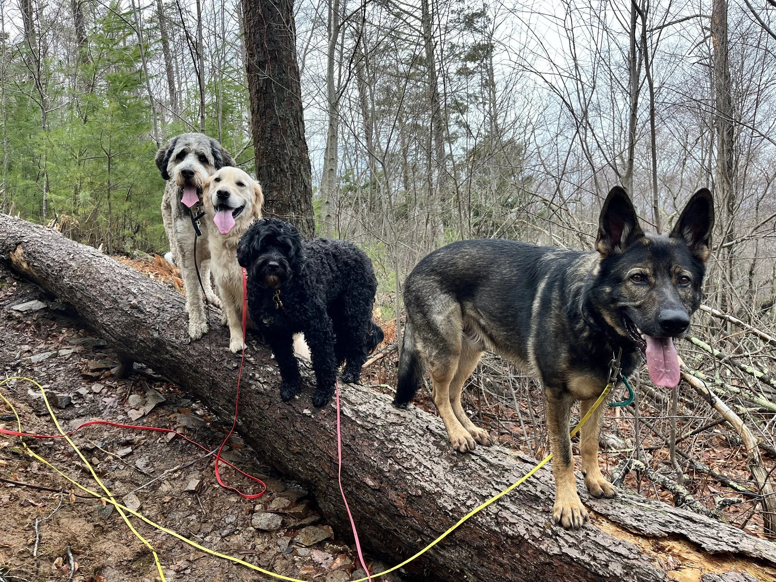 Pickles, Beacon, Cersei, and Danny on a Pack Hike