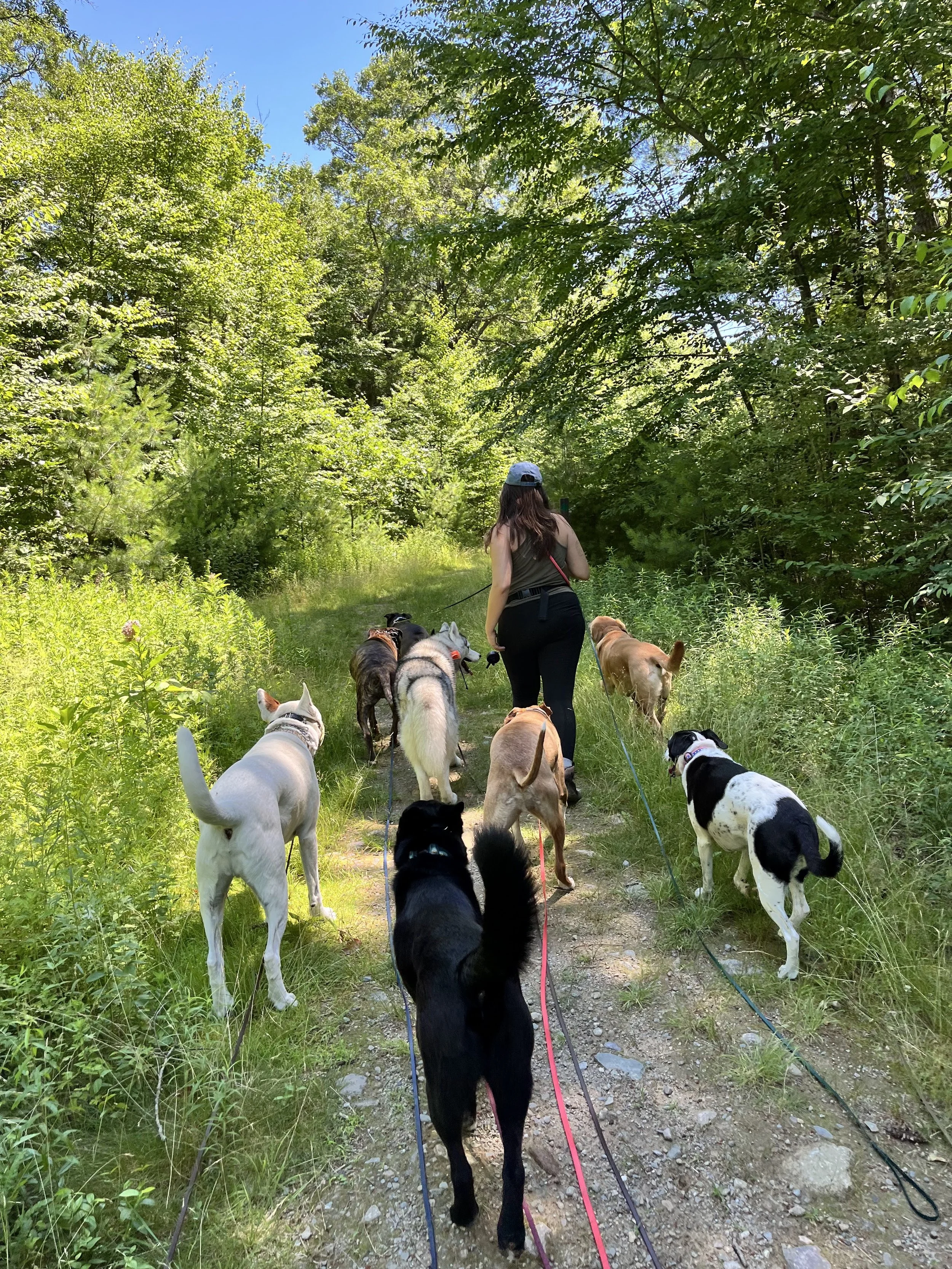 Scout, Tiger, Yukon, Cooper, Walker, Ollie, Pepper, and Sox walking with Clara on Pack Hike