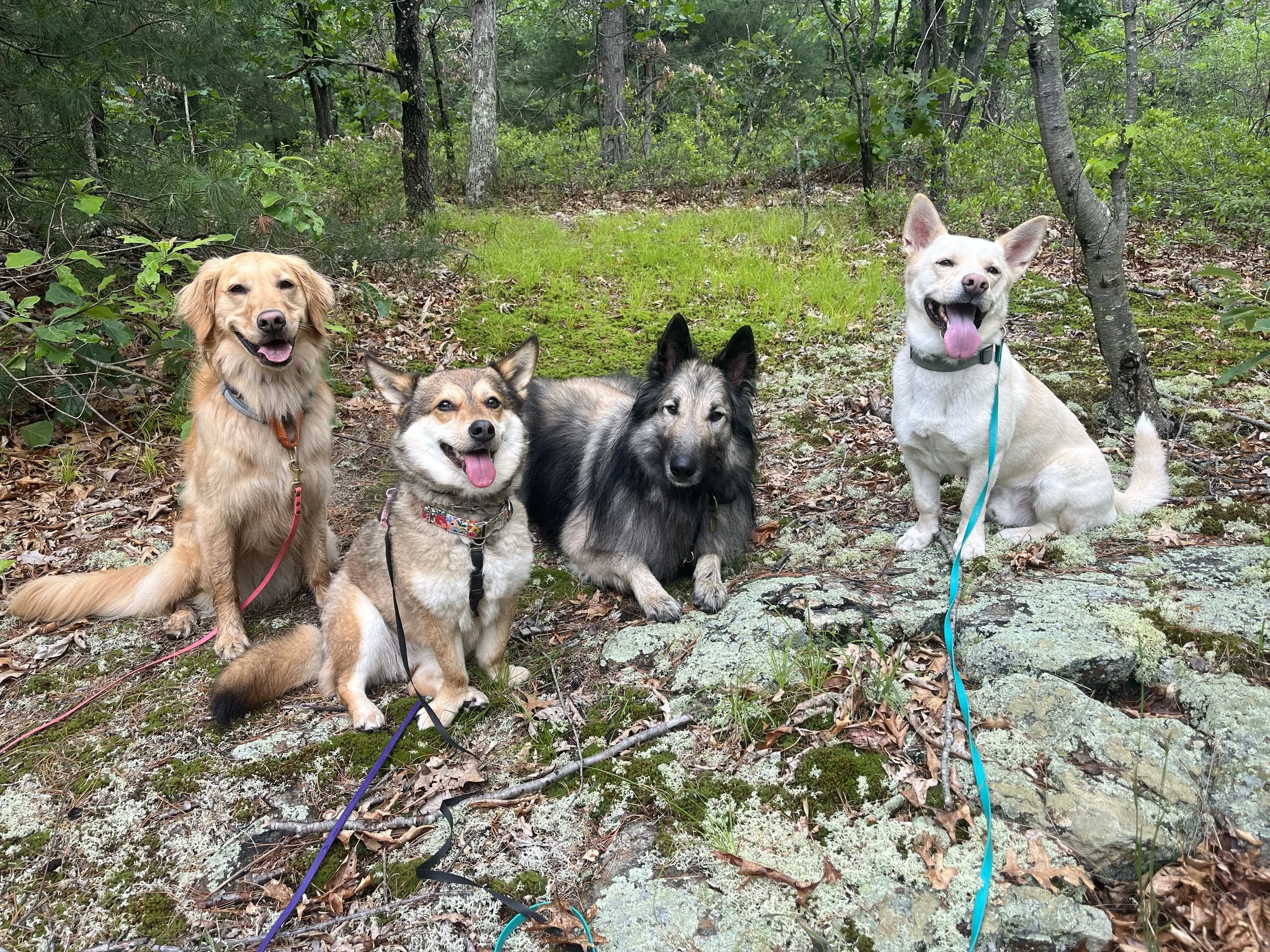 Kona, Zelda, Winston, and Mulligan practicing Stay on Pack Hike