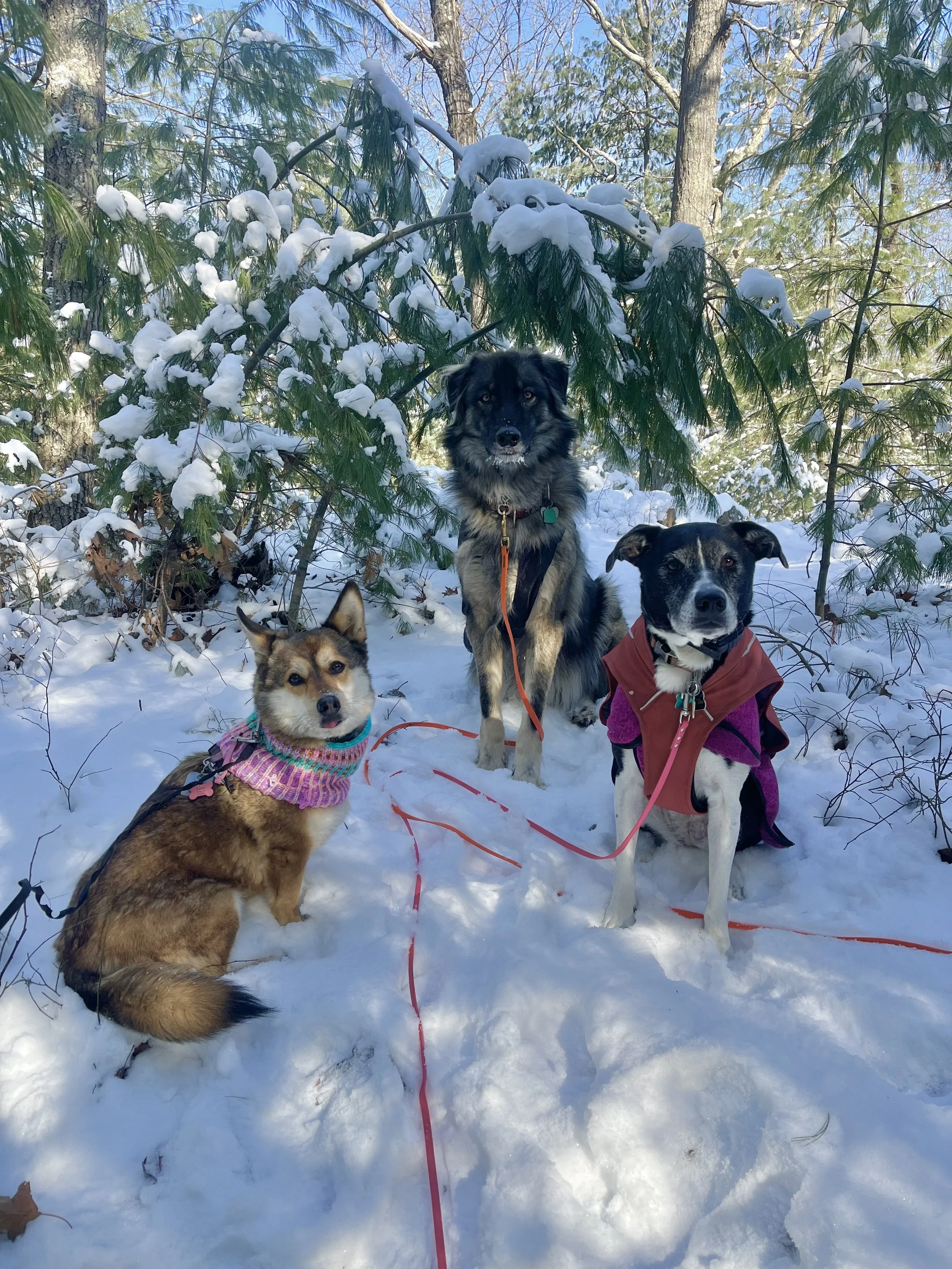 Winston, Mulligan, and Zelda mid recall on a pack hike
