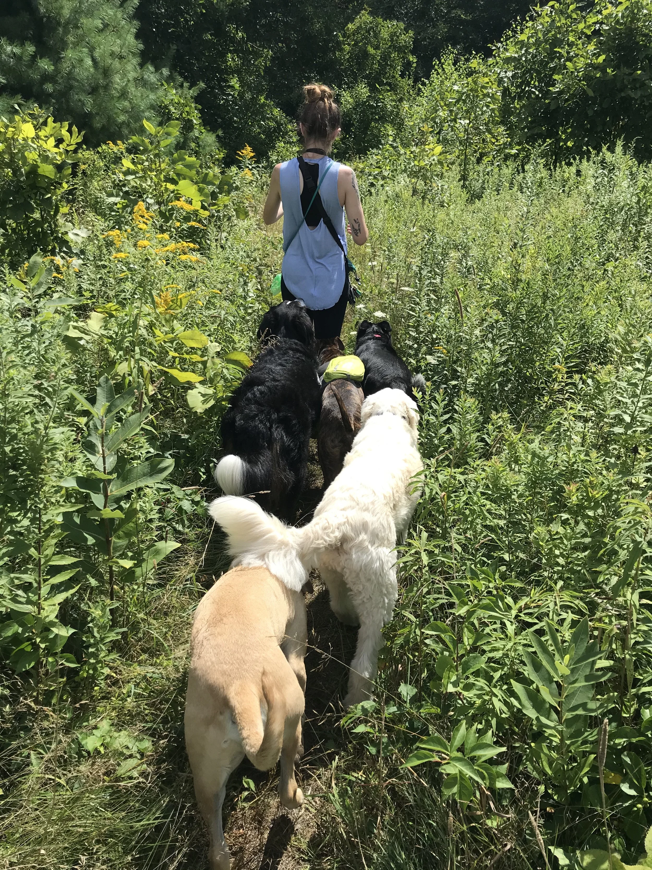 Effie, Dean, Danny, Beacon, and Beckett walking with Micaela on a Pack Hike